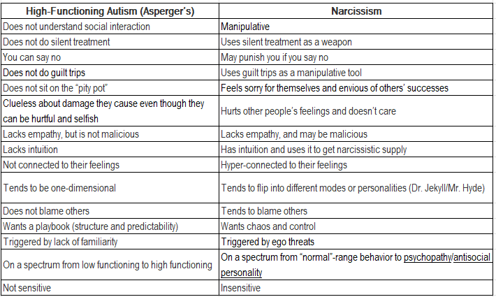 There are both advantages and disadvantages to autism. On the one hand, the disadvantages are mostly attributed to social factors, and on the other hand, there are also some good things about it. It is possible for autistic individuals to make real friends. Narcissism is a dysfunctional personality trait that occurs as a result of some form of abuse or trauma, typically from one’s parents or guardians. It is only about preserving oneself that these people care about. They can only exploit on various levels because they cannot form true bonds.