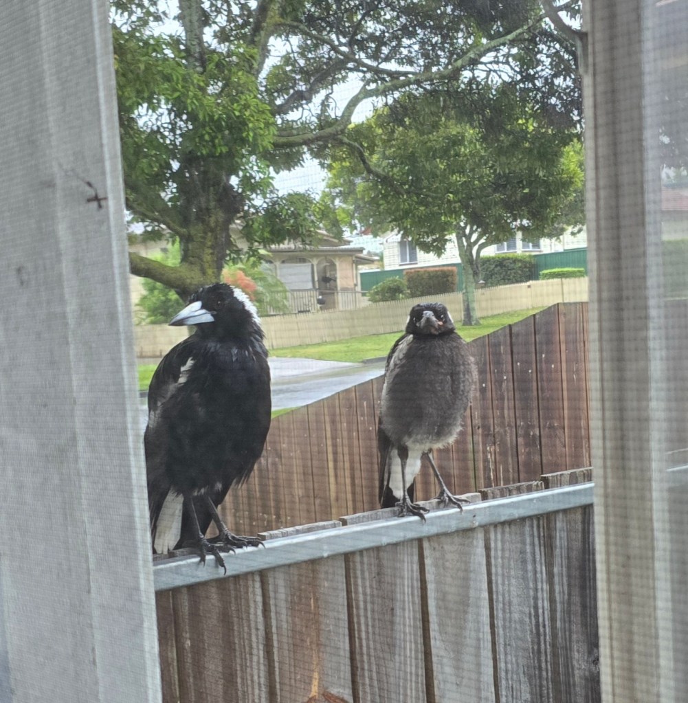 Two adult magpies would land in the yard and call out. Then, a fluffy young magpie would appear, a bit unsteady, begging for food and practising short flights. We started to look out for them. It became a small ritual in the middle of everything else going on.